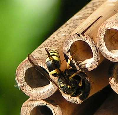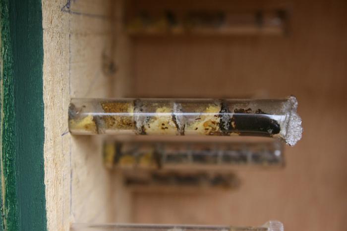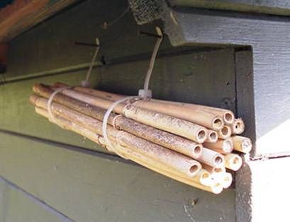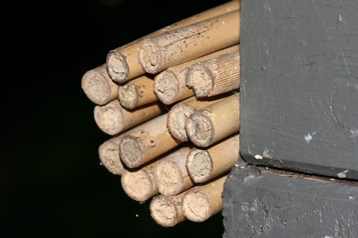 Wer sich diese Mühe nicht machen möchte, kann auch einfach ein paar Bambusrohre zusammenbinden und unter ein Schuppendach befestigen. Ich habe dazu Kabelbinder verwendet.![]() Sie werden ab Anfang März belegt. Bereits Anfang Mai sind die meisten Röhren geschlossen.