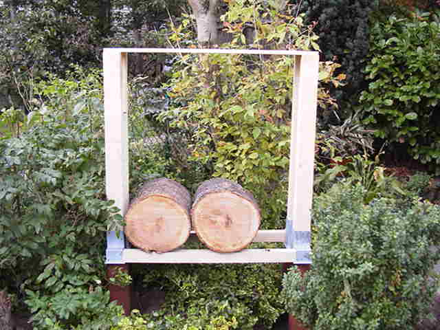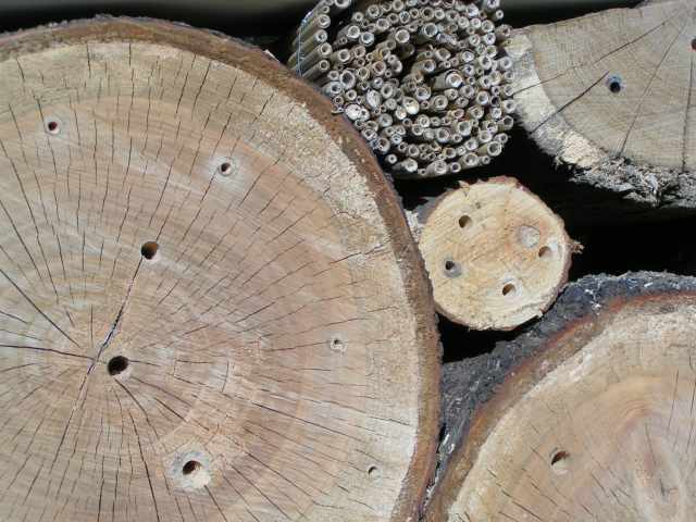Jetzt noch Löcher in das zur Verfügung stehende Material (Ziegelsteine, Baumscheiben, Holzscheite,)