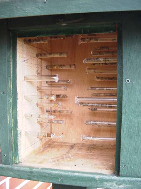 Mann/Frau kann es auch so machen, wie mein Schwager, einfach ein Vogeläuschen umbauen.Als Röhren hat er Reagenzgläschen mit einem Druchmesser von 4 bis 6 mm genommen. ![]() Die eine Seitenwand ist abnehmbar, sodass Kinder als auch Erwachsene, das Treiben im Gelege verfolgen können.